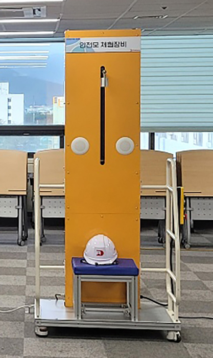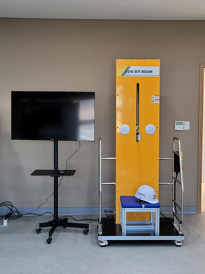 본 장비는 산업현장에서 설비 보전이나 부품 교체 작업 중, 좁은 공간에서 몸을 숙인 상태로 작업하거나 머리 위 위험 요소를 인지하지 못해 발생할 수 있는 낙하물 사고를 체험할 수 있도록 설계된 안전모 충격 체험 장비입니다. 체험자는 앉은 자세에서 중량추 낙하 충격을 직접 비교 체험함으로써, 안전모 미착용 시 발생할 수 있는 위험성과 보호구 착용의 필요성을 명확하게 인식하게 됩니다. 또한 사고 상황을 연출하는 효과음을 스피커로 구현하여 낙하 순간의 충격음과 현장감을 강화함으로써 교육 몰입도를 한층 높였습니다.