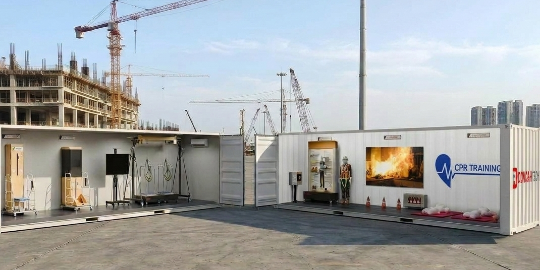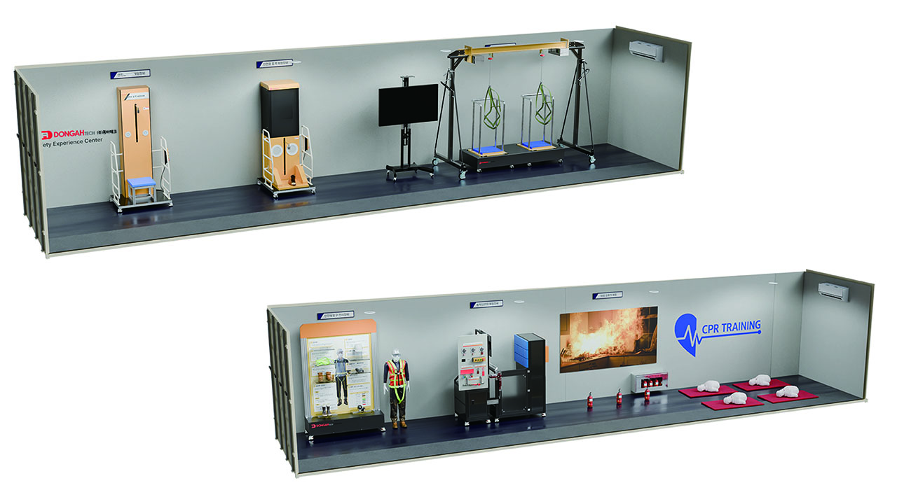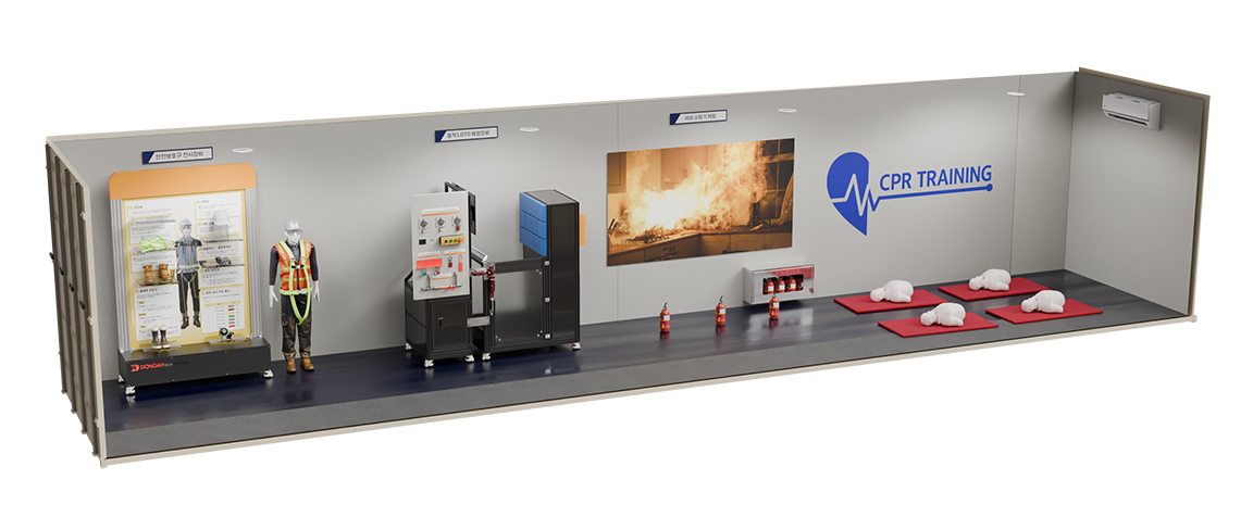 컨테이너 내부에 안전체험 장비와 교육 콘텐츠가 통합 설치되어 있어 건설현장, 산업현장, 공공기관, 교육기관 등 필요한 장소로 이동하여 바로 안전체험 교육을 운영할 수 있습니다.